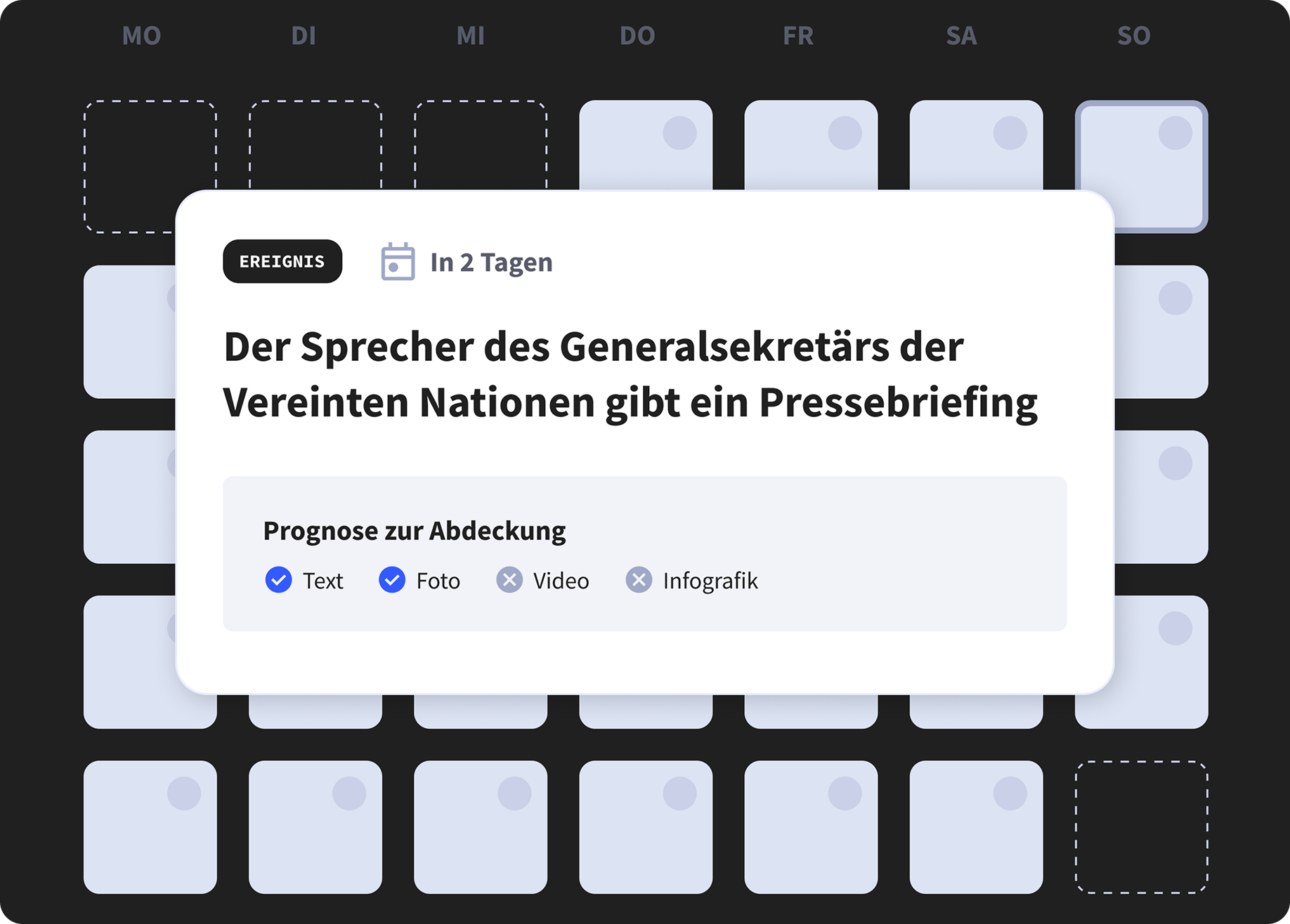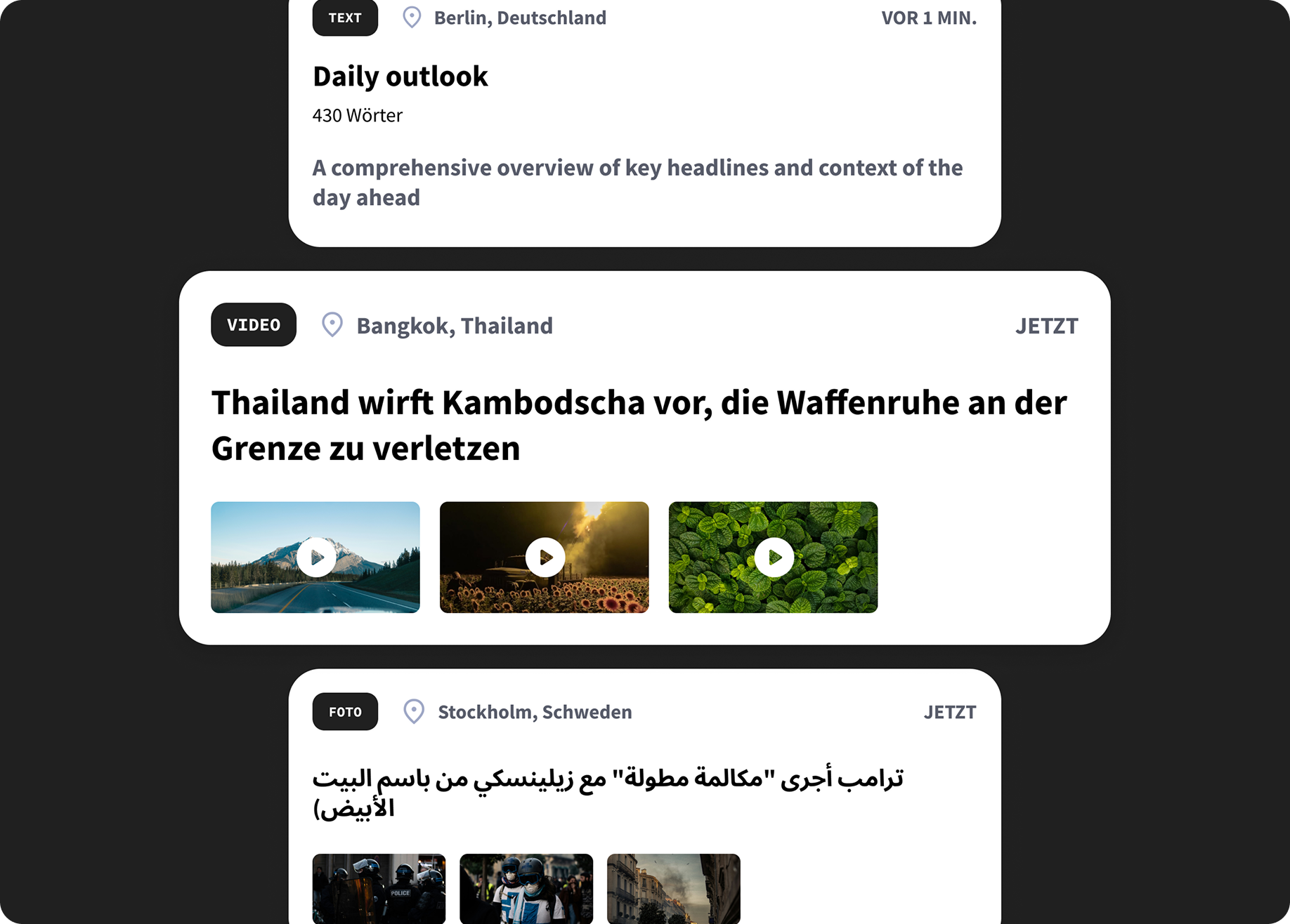 AFP News ist eine intuitive Plattform, die Ihnen rund um die Uhr Zugriff auf sämtliche Inhalte von AFP und Partnern bietet: Texte, Fotos, Videos, Videografiken, Infografiken und Social Stories.