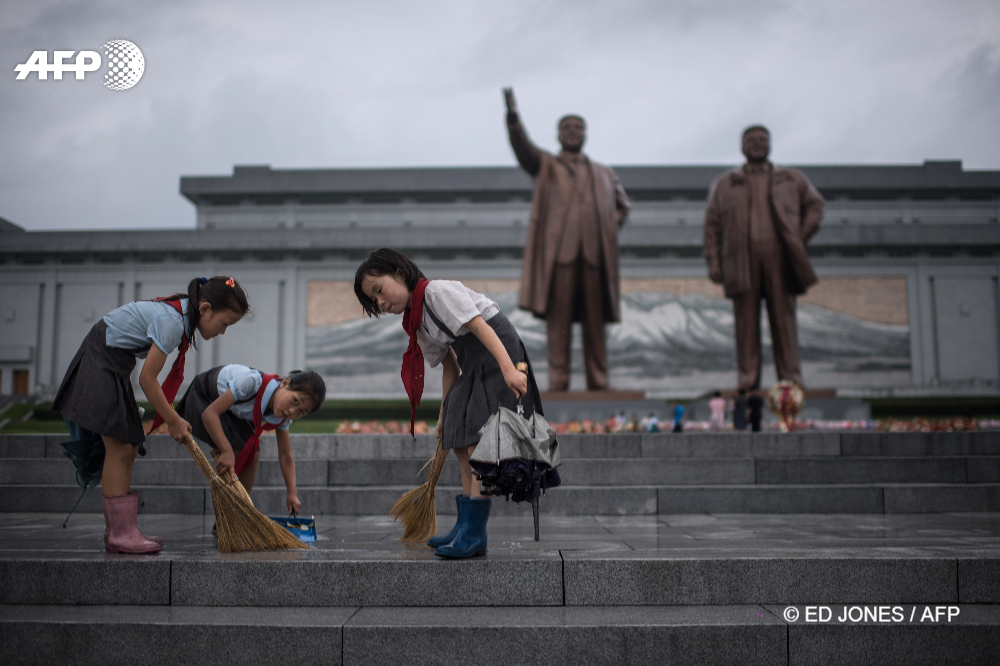 27/07/2017 - Pyongyang, North Korea - Students clean the steps in front of the statues of late North Korean leaders Kim Il-Sung and Kim Jong-Il at Mansu hill as the country marks 'Victory Day' in Pyongyang on July 27, 2017. July 27, which is the 64th anniversary of the signing of the Korean Armistice Agreement, is a public holiday in the nuclear-armed North and celebrated as Victory Day. © ED JONES / AFP