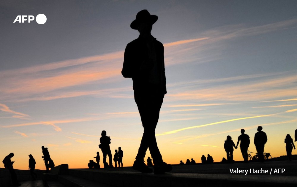 A man walks on the Promenade des anglais during the sunset in Nice, on November 5, 2022.