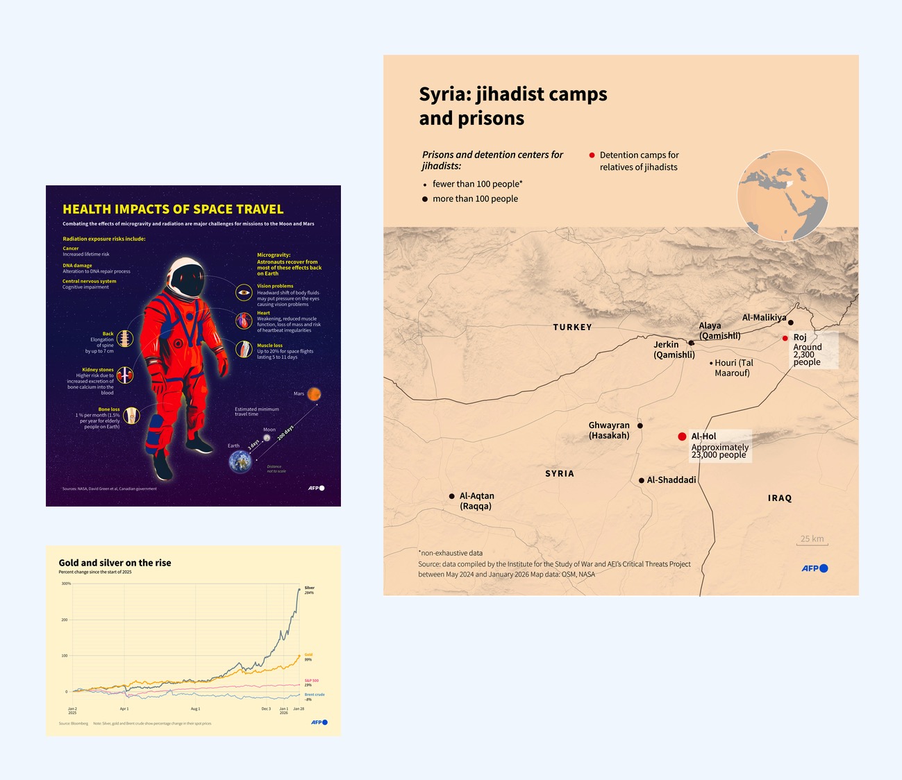 AFP Graphics are designed for the written press, websites and mobile applications and cover the main news stories, financial markets and major sports events, with special additional production for other important events.