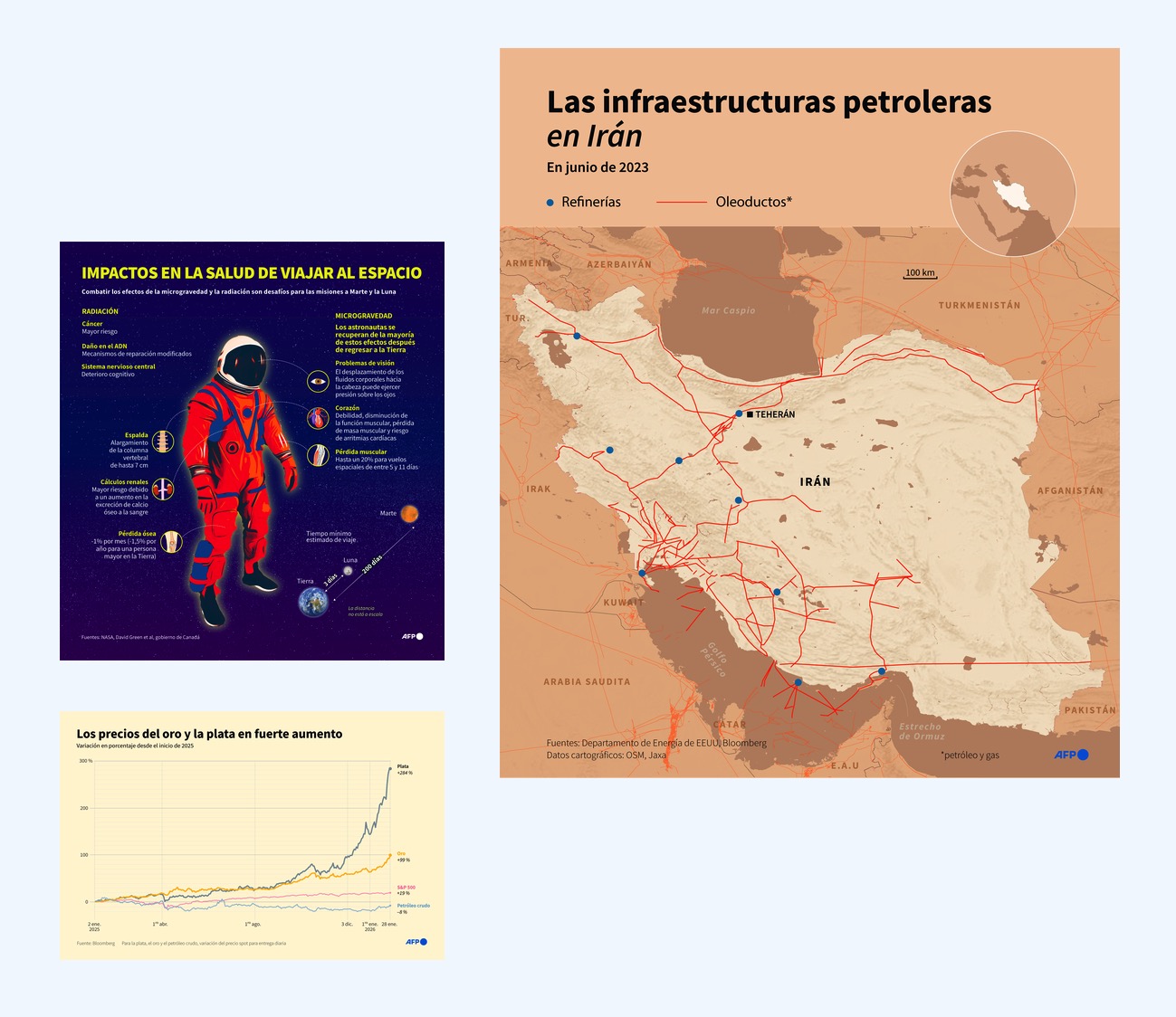 Las infografías de AFP, son diseñadas para la prensa escrita, sitios web y aplicaciones para móviles. Cubren lo esencial de la actualidad, desde las bolsas de valores a las principales competiciones deportivas, incluyendo una producción especial extraordinaria para los grandes eventos.