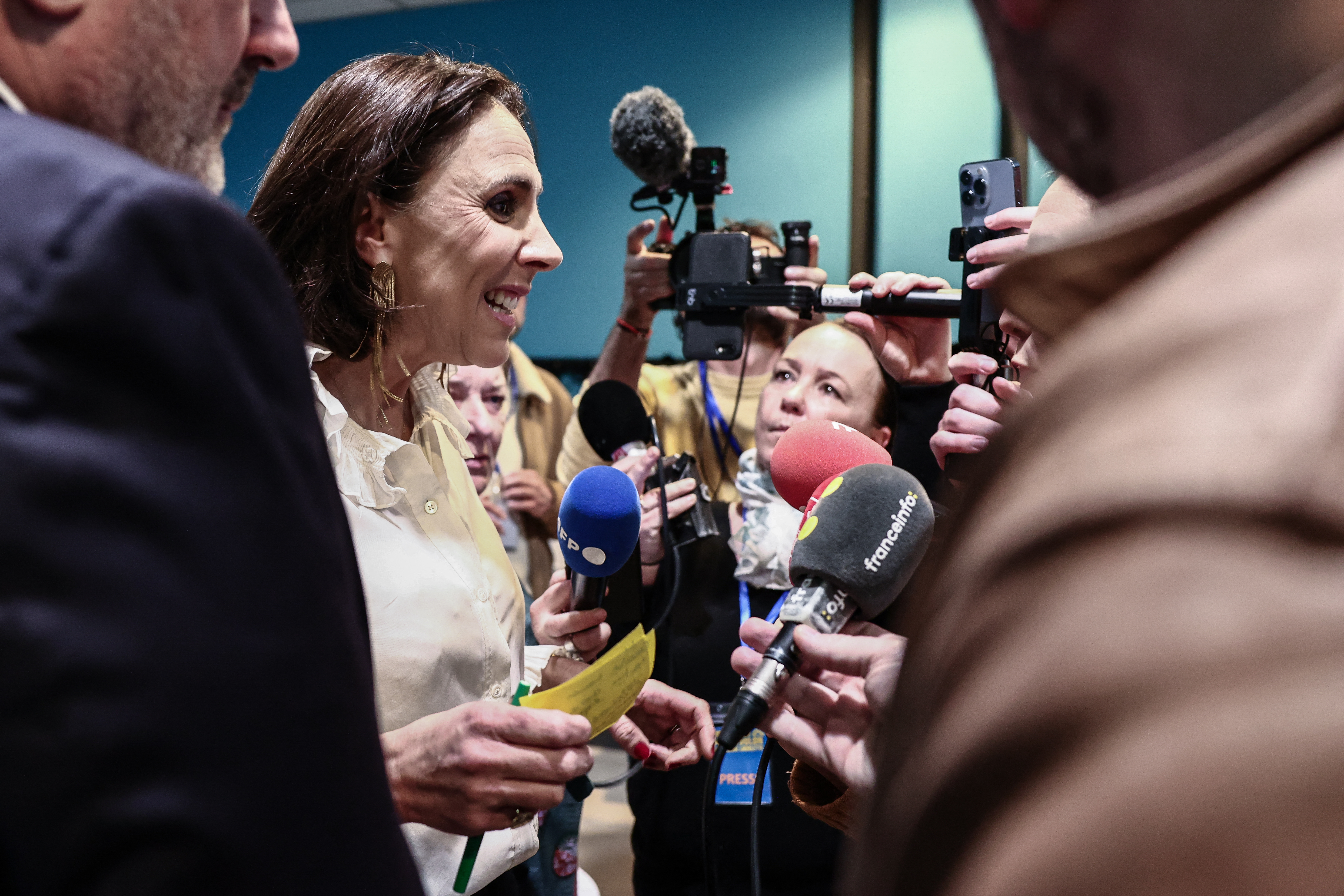 (2) La secrétaire nationale des Écologistes (EELV), Marine Tondelier (G), et la maire de Strasbourg candidate à sa réélection, Jeanne Barseghian, donnent une conférence de presse consacrée aux élections municipales de 2026, à Strasbourg, le 16 janvier 2026. © Frederick Florin / AFP