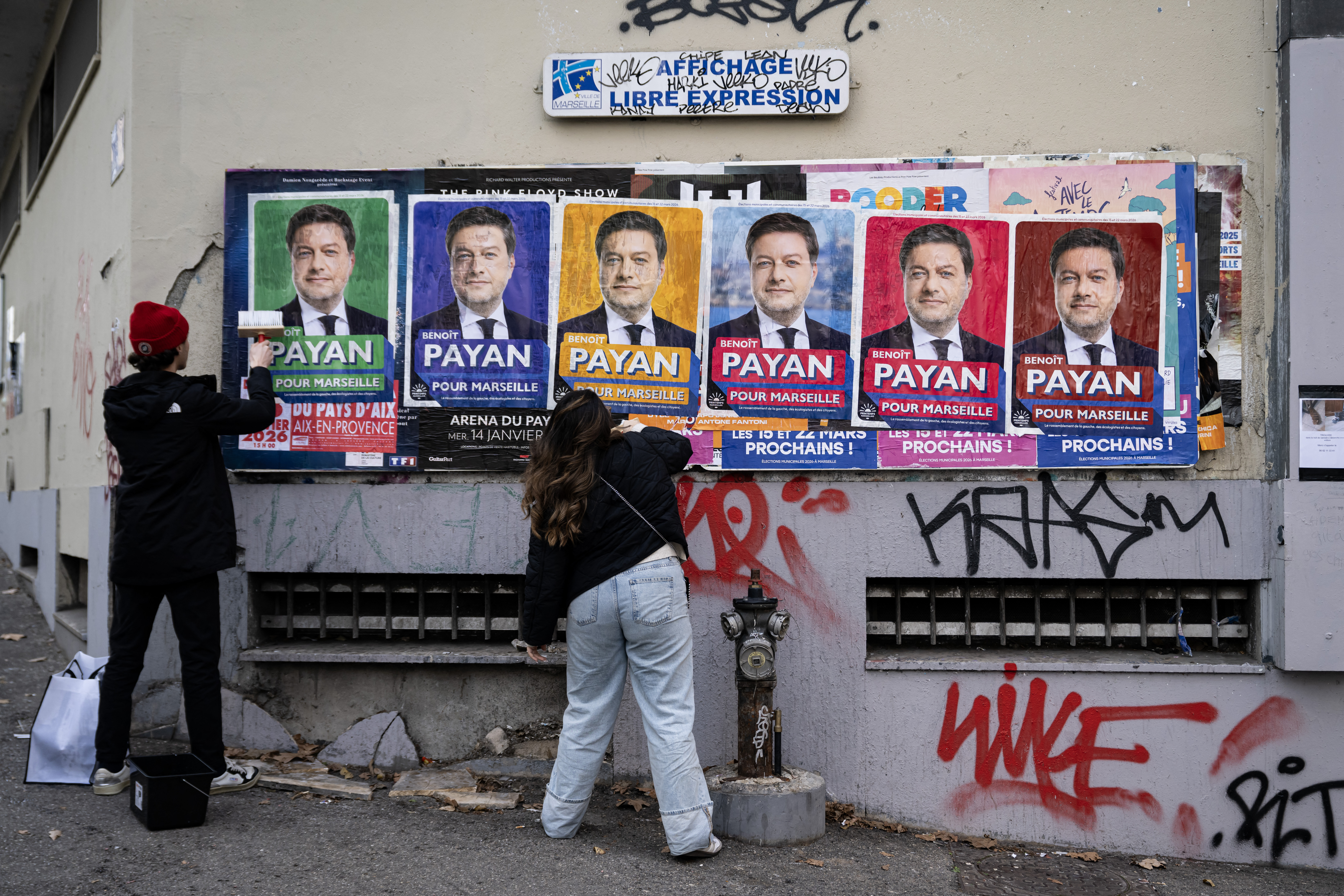 Des militants affichent des posters électoraux du maire sortant de Marseille et candidat à sa réélection, Benoît Payan, dans le centre-ville de Marseille, le 20 janvier 2026, en vue des prochaines élections municipales françaises. © Miguel Medina / AFP