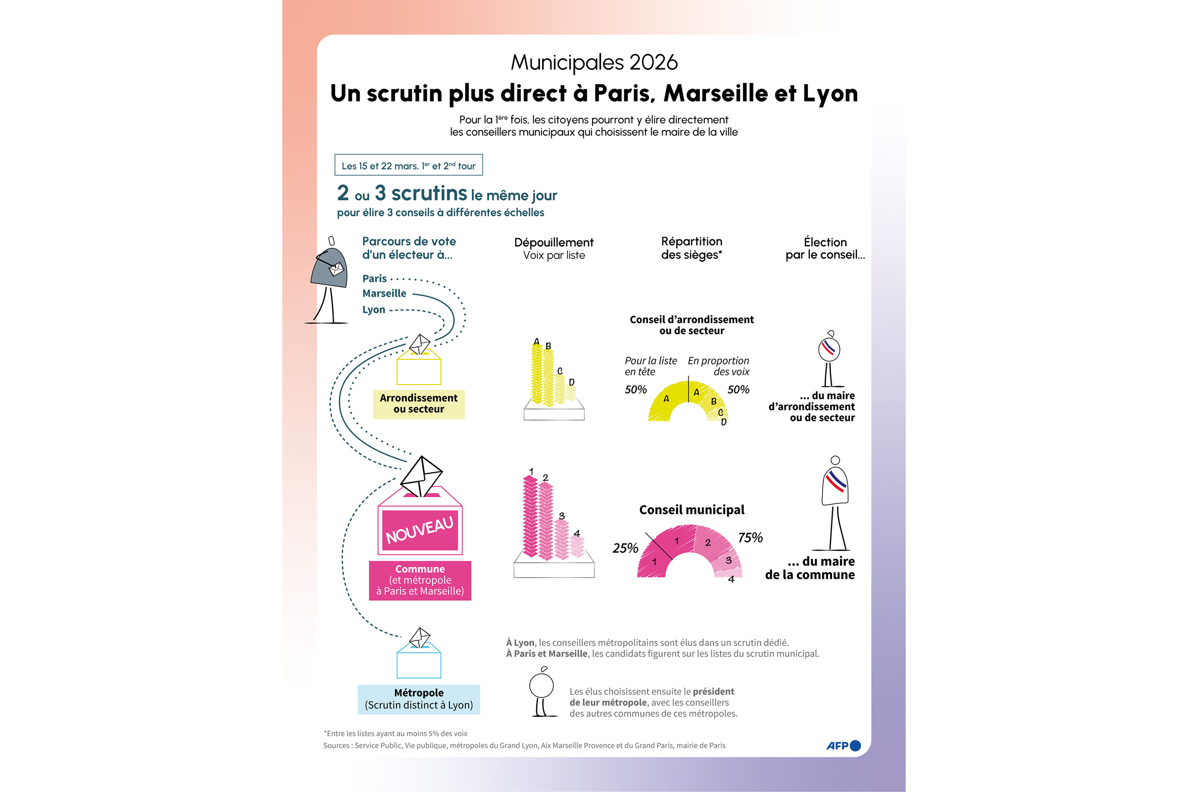 Présentation des modes de scrutin spécifiques à Paris, Marseille et Lyon pour les élections municipales de 2026, à la suite de la réforme électorale d'août 2025. © Valentina Breschi / AFP