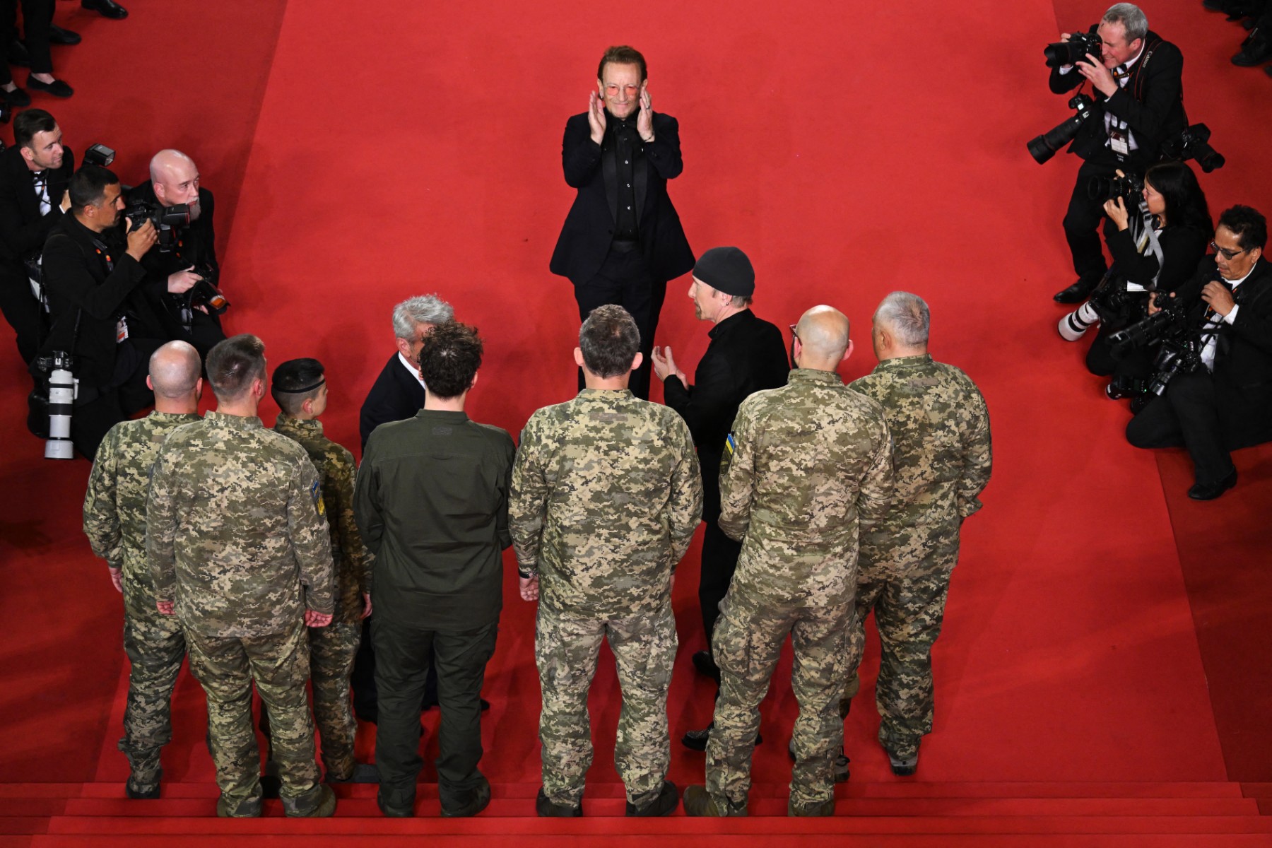 Le musicien britanno-irlandais The Edge, le chanteur et auteur-compositeur irlandais Bono, ainsi que l’acteur, scénariste et réalisateur américain Sean Penn posent avec des soldats ukrainiens à leur arrivée pour la projection du film « Bono: Stories of Surrender », le 16 mai 2025. © Bertrand Guay / AFP