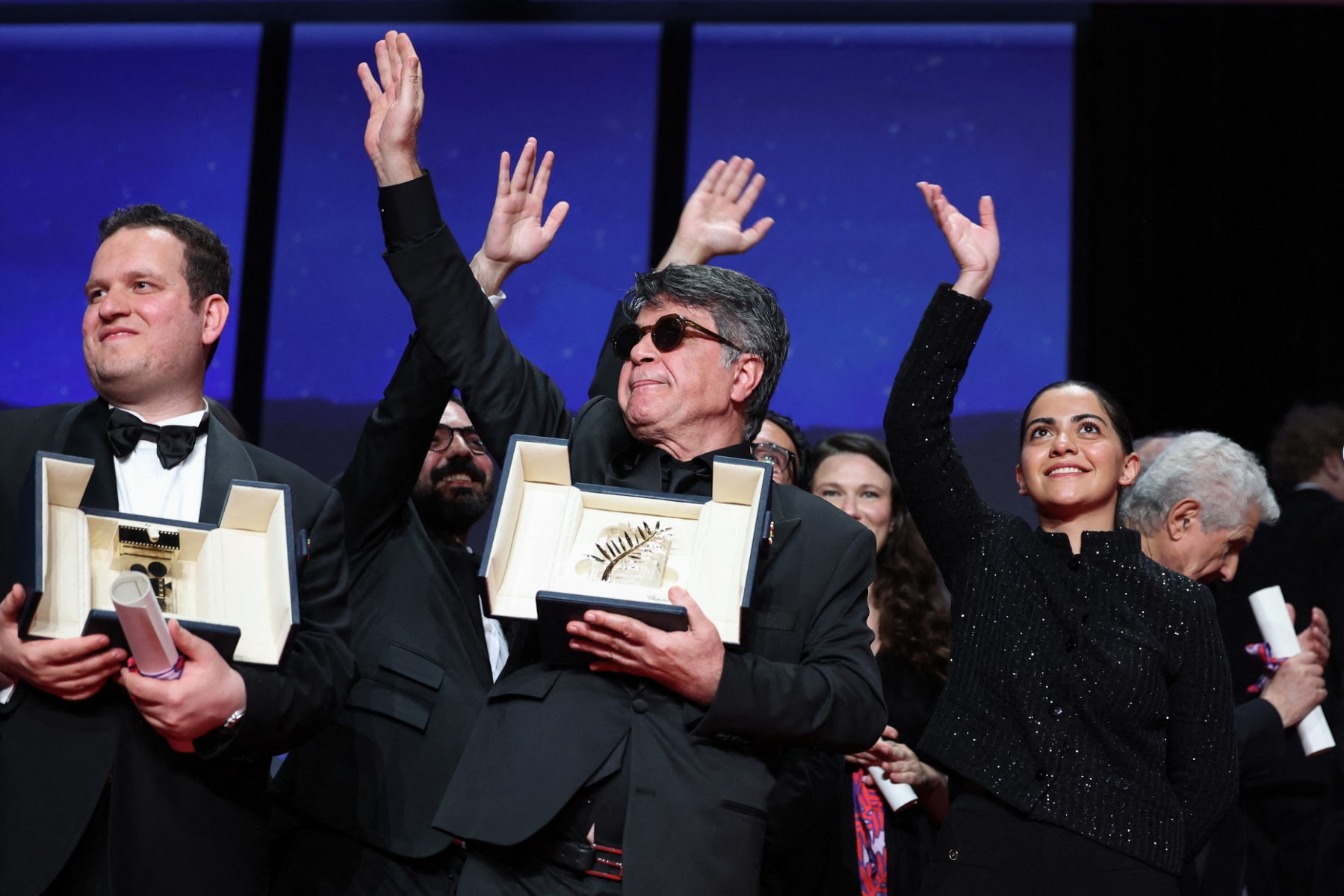 • 1re photo : De gauche à droite, les actrices iraniennes Hadis Pakbaten et Maryam Afsharimovahed, l’acteur iranien Majid Panahi aux côtés du réalisateur, scénariste et producteur iranien Jafar Panahi après avoir remporté la Palme d’or pour le film « Un simple accident », le 24 mai 2025. © Valery Hache / AFP