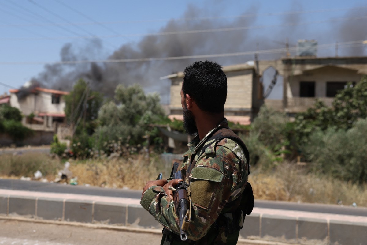 (2) Un membre des forces de sécurité syriennes, près de Soueida, le 14 juillet 2025. Au moins 89 personnes ont été tuées dans la province de Soueida alors que les affrontements entre tribus bédouines sunnites et combattants druzes se poursuivaient. © Bakr Alkasem / AFP