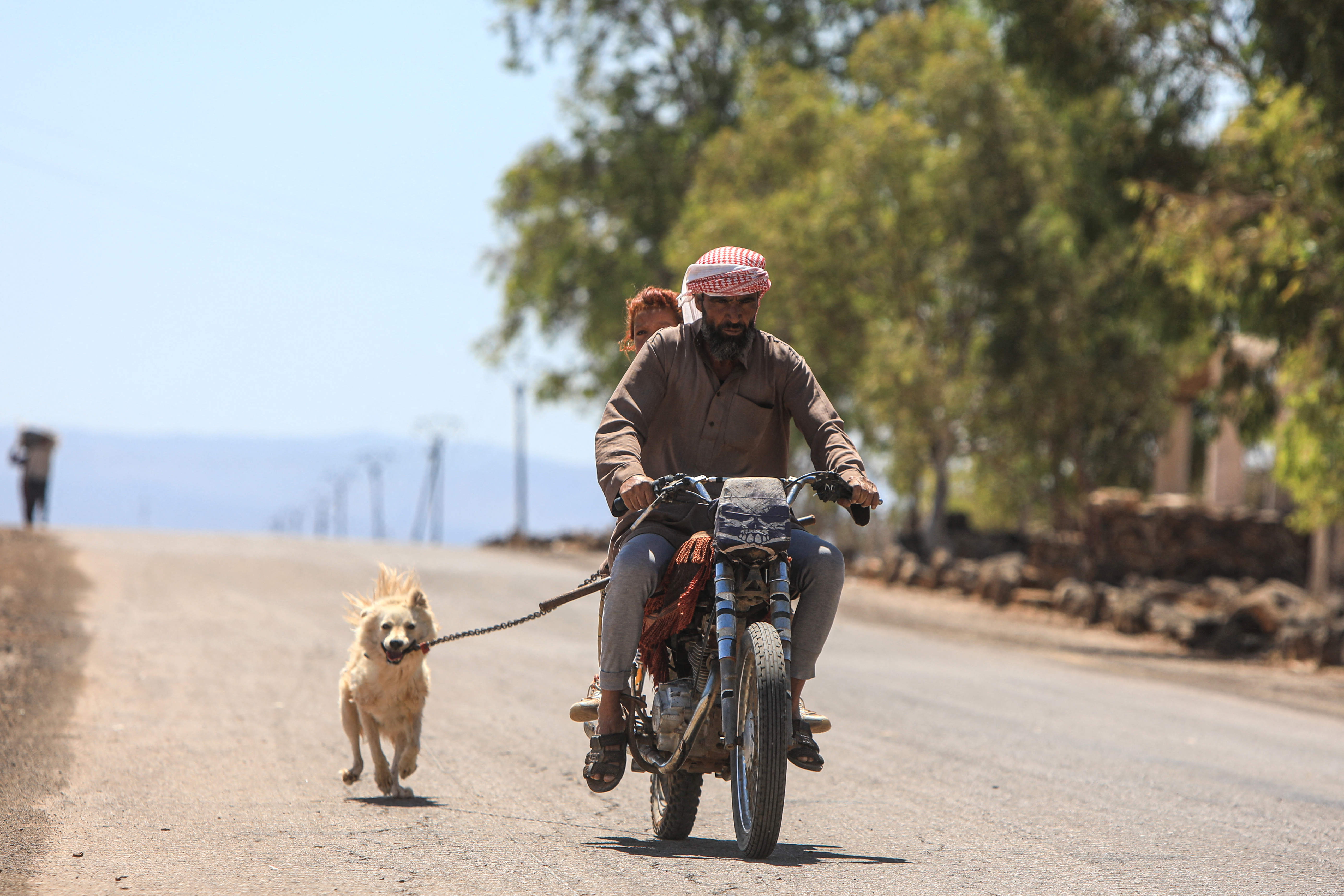 Des Bédouins à moto, quittant les environs du village druze d’al-Mazraa dans le gouvernorat de Soueida, le 17 juillet 2025, après des affrontements. La province de Soueida est en proie à des violences sectaires meurtrières depuis le 13 juillet, lors d’affrontements opposant des combattants druzes aux tribus bédouines sunnites ainsi qu’à l’armée et à ses alliés. © Bakr Alkasem / AFP