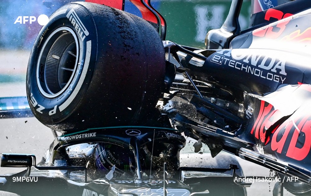 Le photographe basé à Belgrade, Andrej Isakovic, remporte le premier prix dans la catégorie « Single Sports » pour son cliché impressionnant de la collision entre la Mercedes du pilote britannique Lewis Hamilton et la Red Bull du Néerlandais Max Verstappen, lors du Grand Prix de Formule 1 d'Italie sur le circuit de l’Autodrome National de Monza, le 12 septembre 2021.