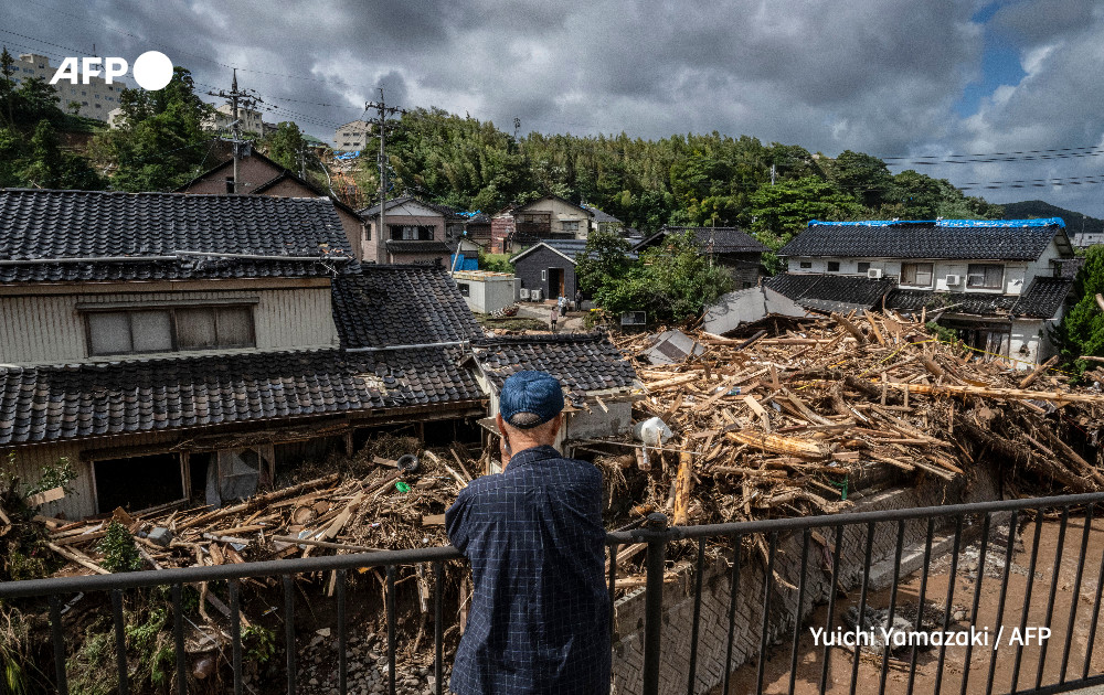 A man looks on as debris washed away from flooding is seen piled by houses along the Tsukada river following heavy rain in Wajima city, Ishikawa prefecture on September 23, 2024.