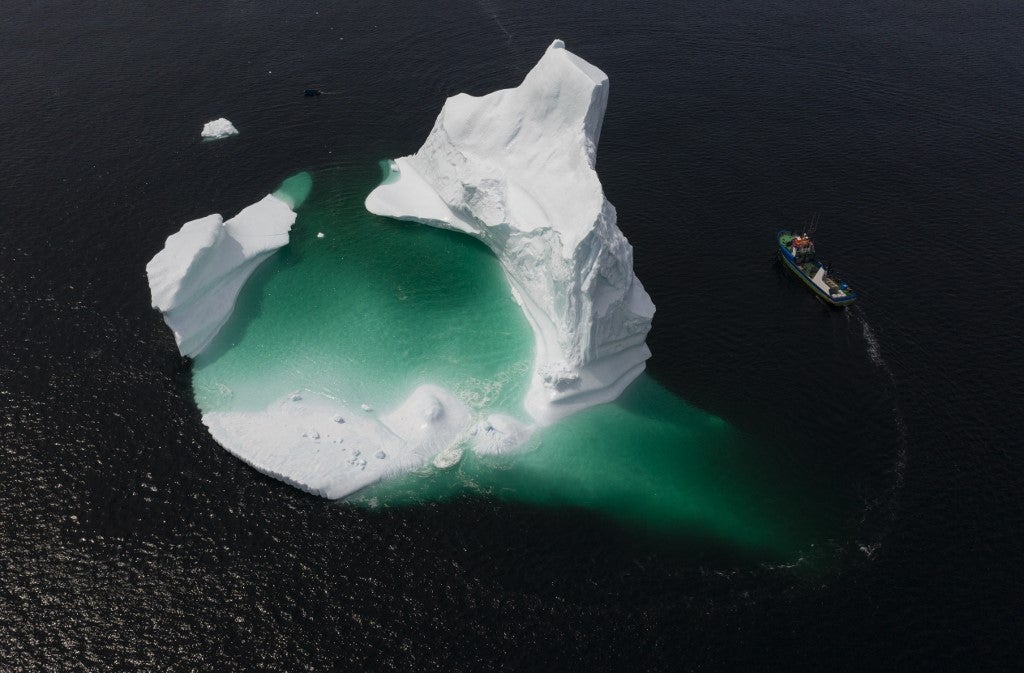 Esta foto aérea mostra o barco do Capitão Edward Kean passando por um iceberg na Baía de Bonavista em 29 de junho de 2019 em Newfoundland, Canadá. Johannes Eisele/AFP